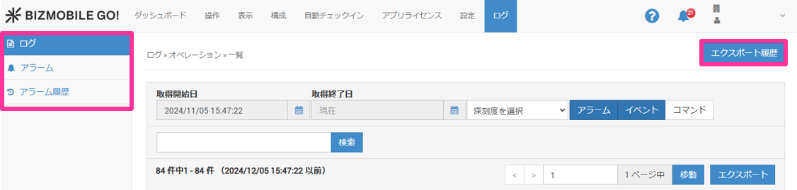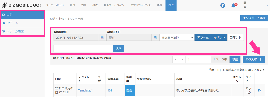 1. 【ログ】→【ログ】・【アラーム】・【アラーム履歴】のうちからエクスポート対象を選択し、各画面で詳細情報を設定、[エクスポート]をクリックします。