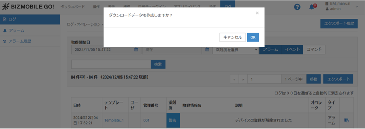 ログとアラームは、期間や種類を指定して、CSV形式でエクスポートすることができます。