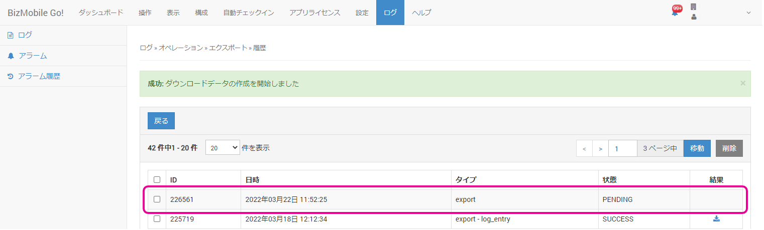 3. 成功: ダウンロードデータの作成を開始しましたのメッセージと、エクスポートデータが状態=PENDINGで表示されますので、少し時間をおいてからブラウザの更新ボタンをクリックします。