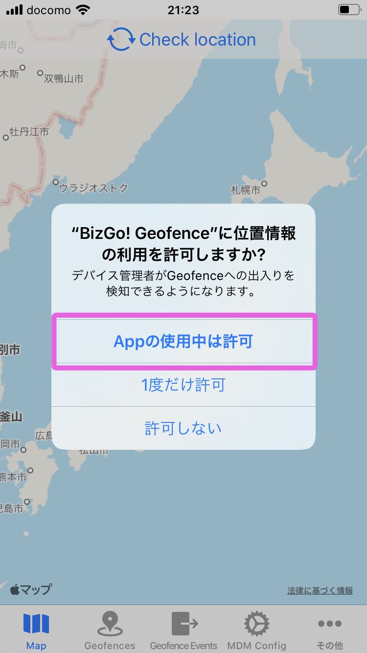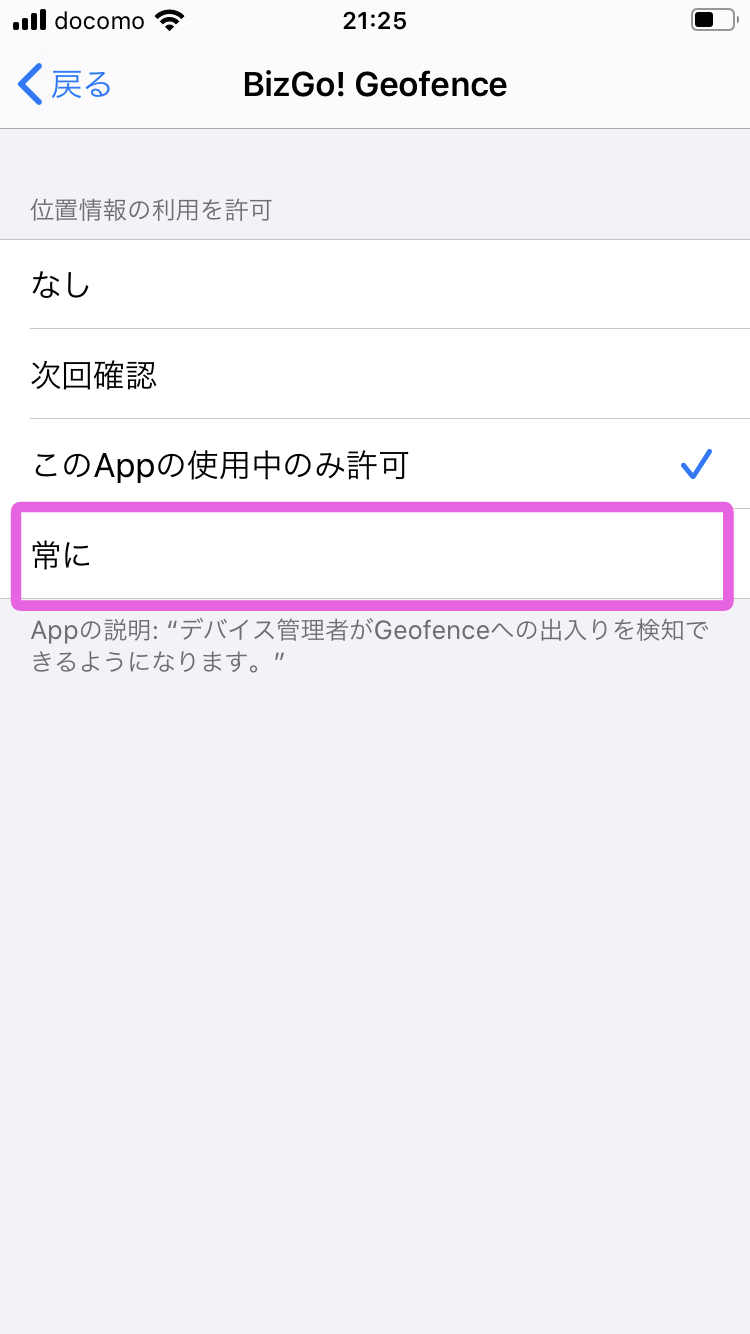 3.BizGo!Geofenceアプリの位置情報設定が「常に許可」になっている