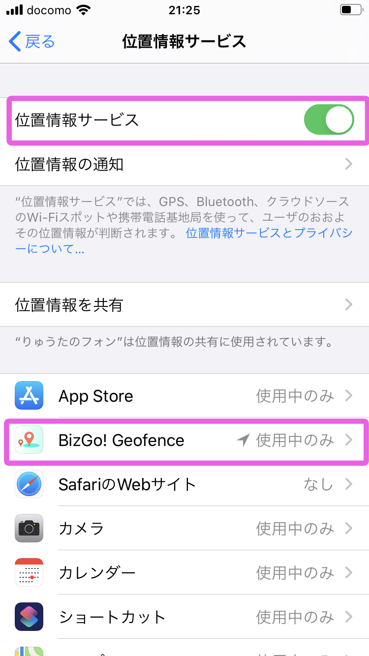 1. 位置情報サービスがONであることを確認し、BizGo!Geofenceをタップします