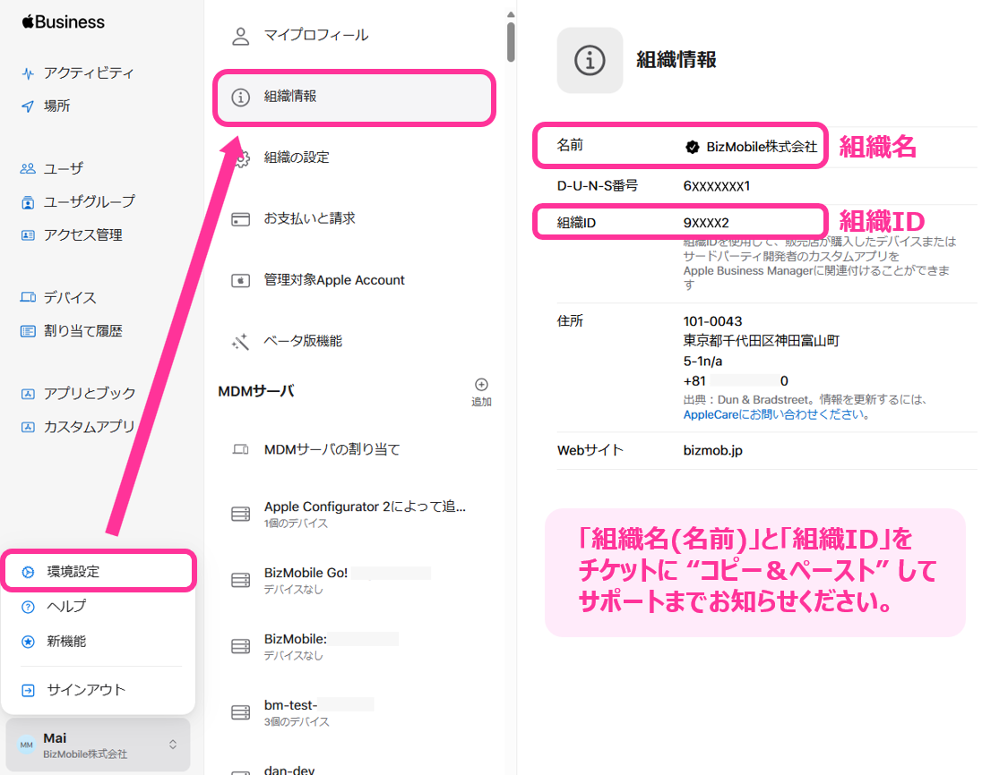 オプションサービスのお申し込み後、Apple Business Manager の以下の情報をコピー&ペーストしてサポート窓口へお知らせください。