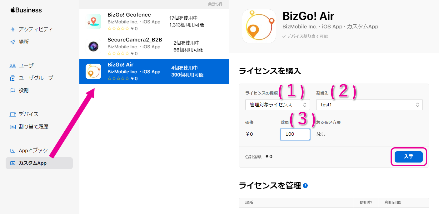 弊社側にてお客様情報の登録が完了しましたら、以下の手順にてアプリの購入、配付を実施ください。