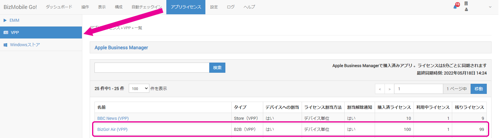 4. 【アプリライセンス】ー>【VPP】から、購入済みアプリ一覧に表示されるまで待ちます(ライセンスは5分ごとに同期されます)。