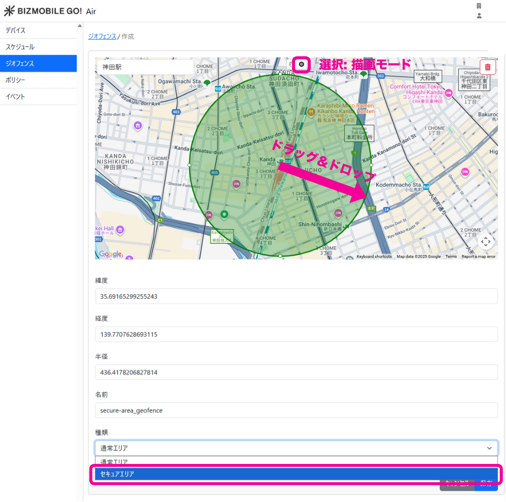 マップ上でドラッグ&ドロップして新たなエリアを描画します。
