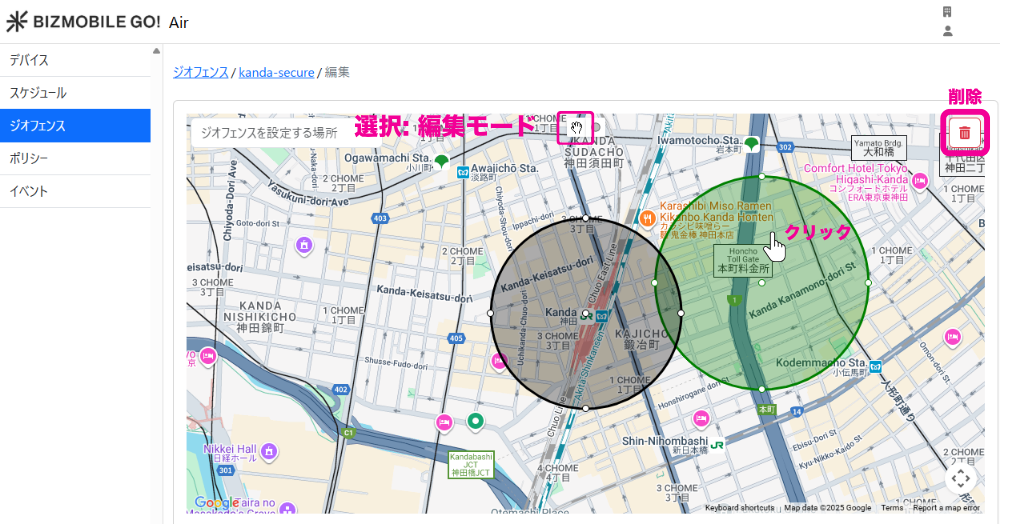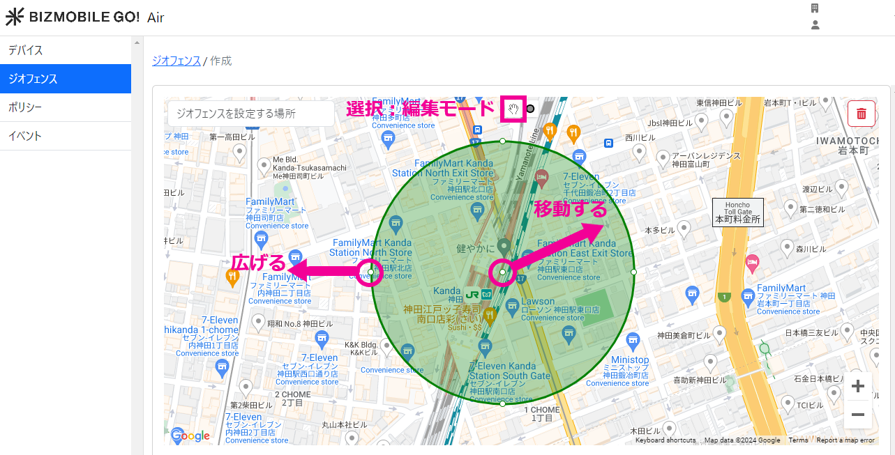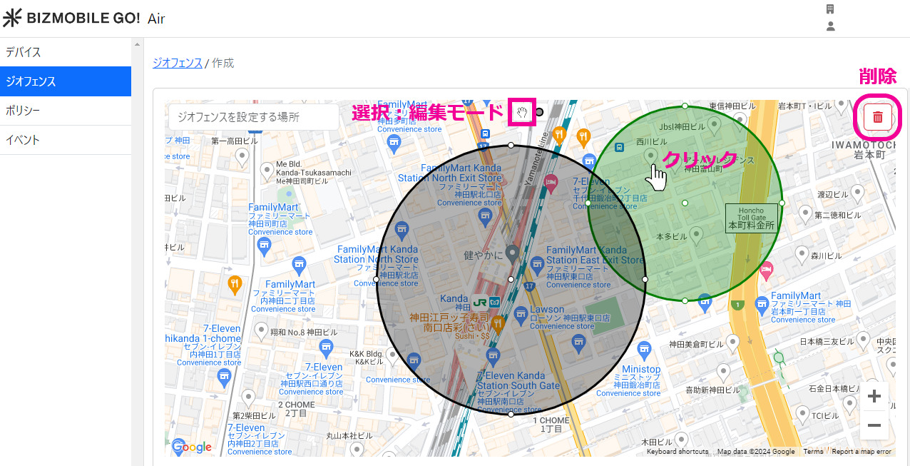 OSの仕様上、出入り検知の対象となる円は一度に最大20個までです。割り当てられているジオフェンスの円の総数が20個を超える場合には、端末の最寄り20個が出入り検知の対象として有効な円となりBizGo! Airのマップ上に緑色の円として表示されます。