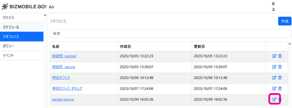 1. 【ジオフェンス】画面で、編集するジオフェンス横の編集アイコンをクリックします。