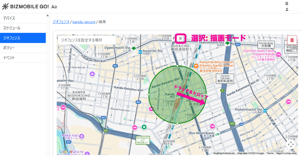 マップ右上のゴミ箱アイコンをクリックし、選択したエリアを削除します。