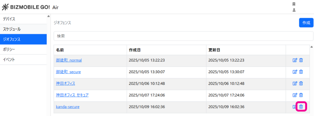 1. 【ジオフェンス】画面で、削除するジオフェンス横のアイコンをクリックします。