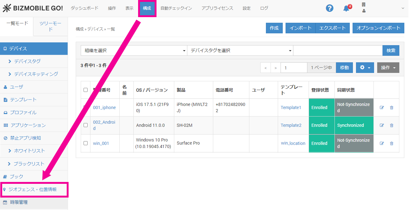 1. メニューバーから、【構成】→【ジオフェンス・位置情報】をクリックします。