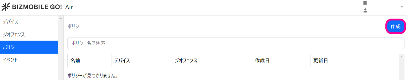2. 【ポリシー】画面にて、[作成]をクリックします。