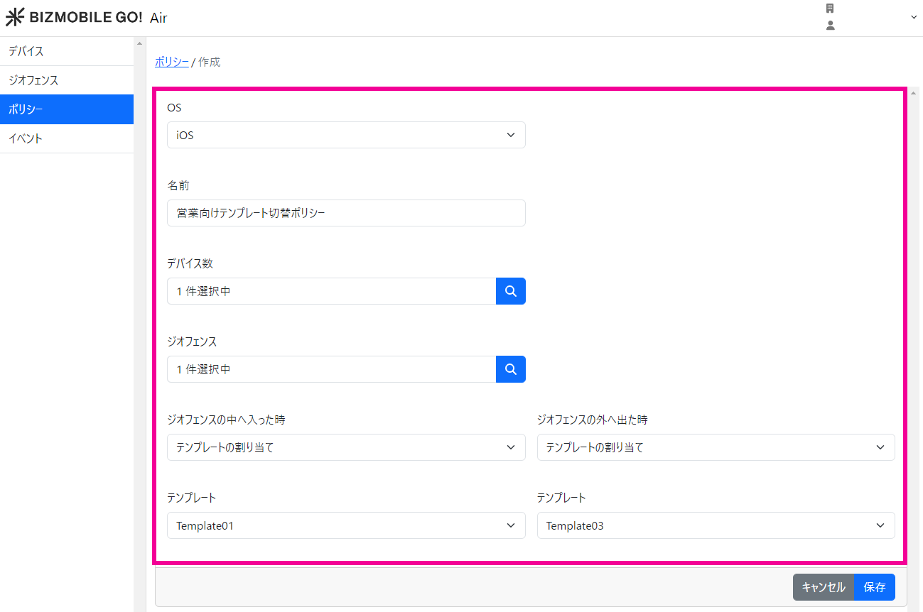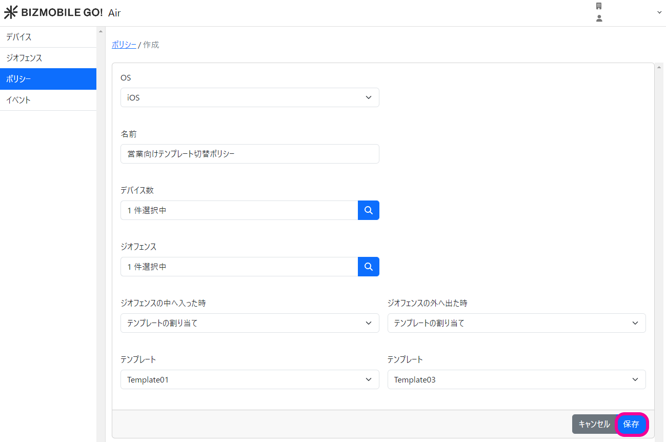 ポリシーとは、対象となるジオフェンスとジオフェンス出入りによって行うアクションを定義するものです。作成したポリシーを複数のデバイスに割り当てることができます。