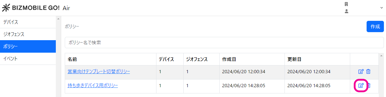 1. 【ポリシー】画面にて、編集するポリシー横の編集アイコンをクリックします。