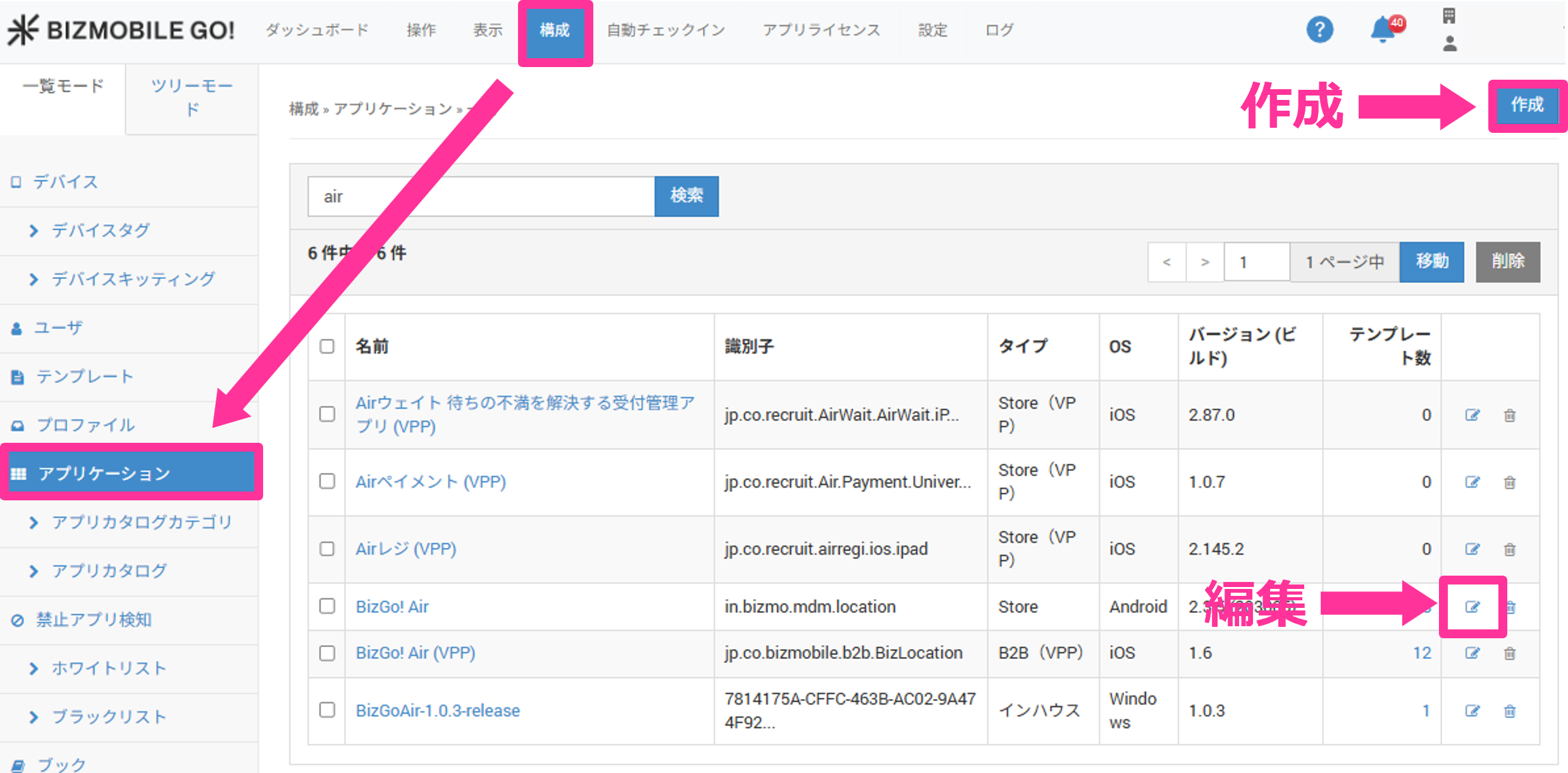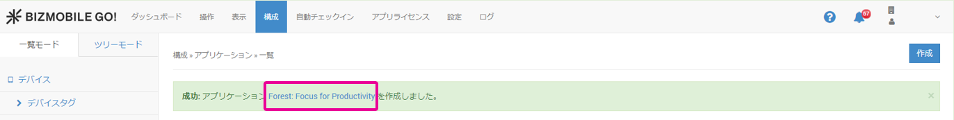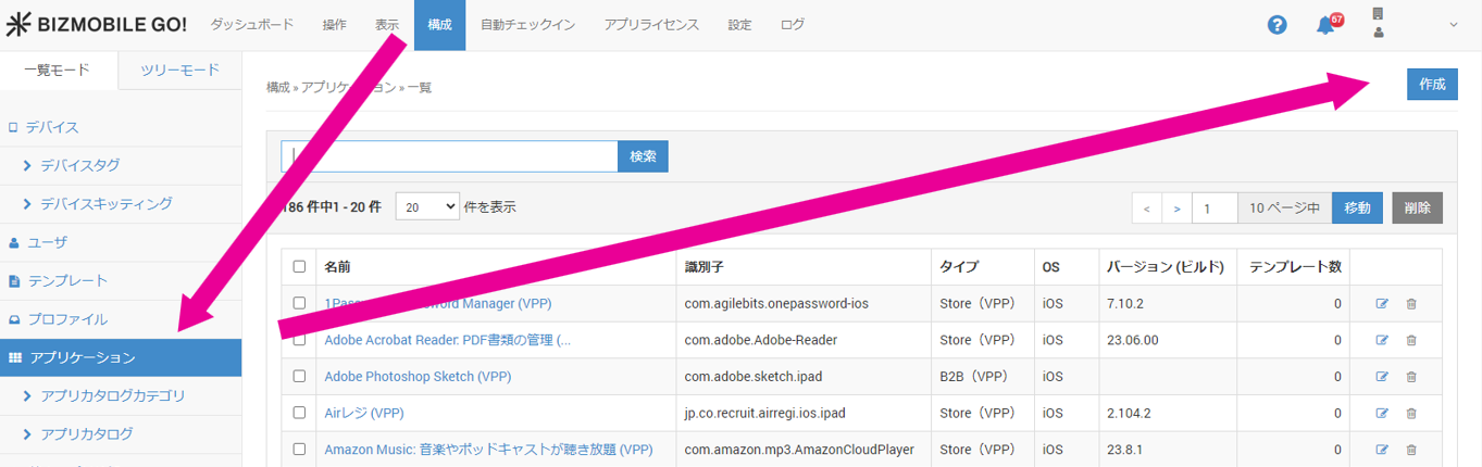 1. 【構成】 → 【アプリケーション】画面から[作成]をクリックします。