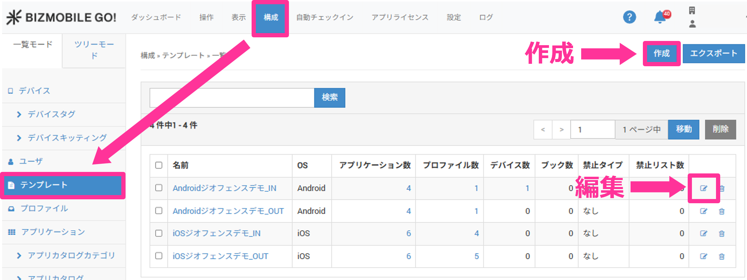 1. [構成]→[テンプレート]から、作成ボタン、またはテンプレートの編集アイコンをクリックします。