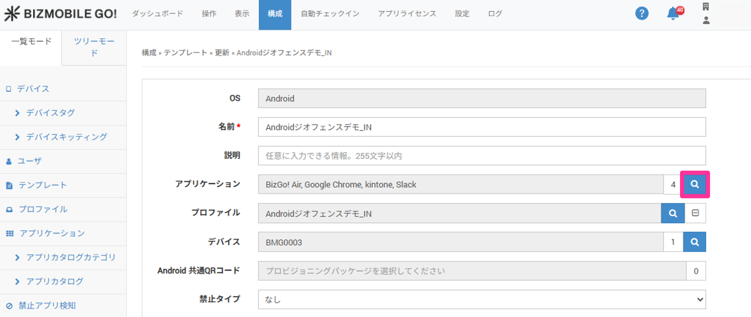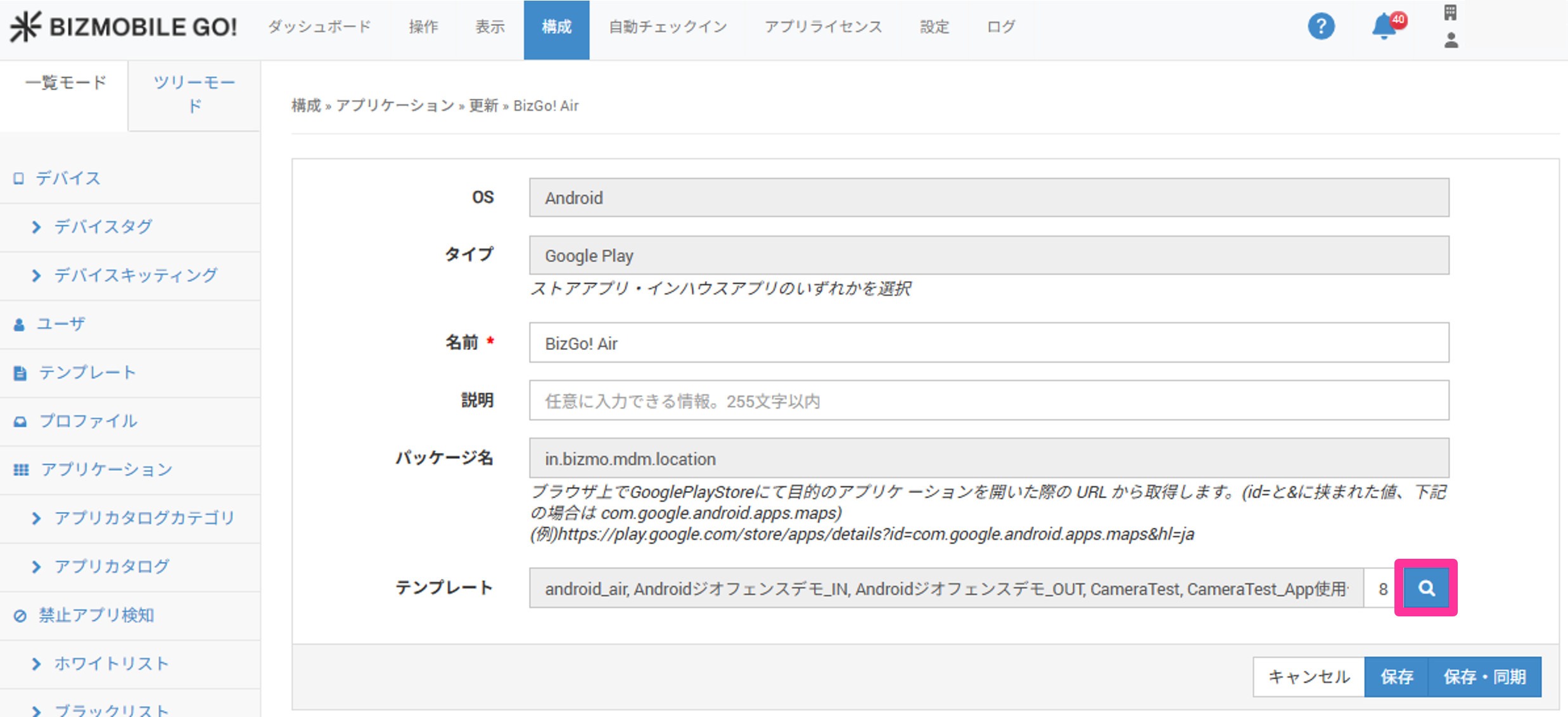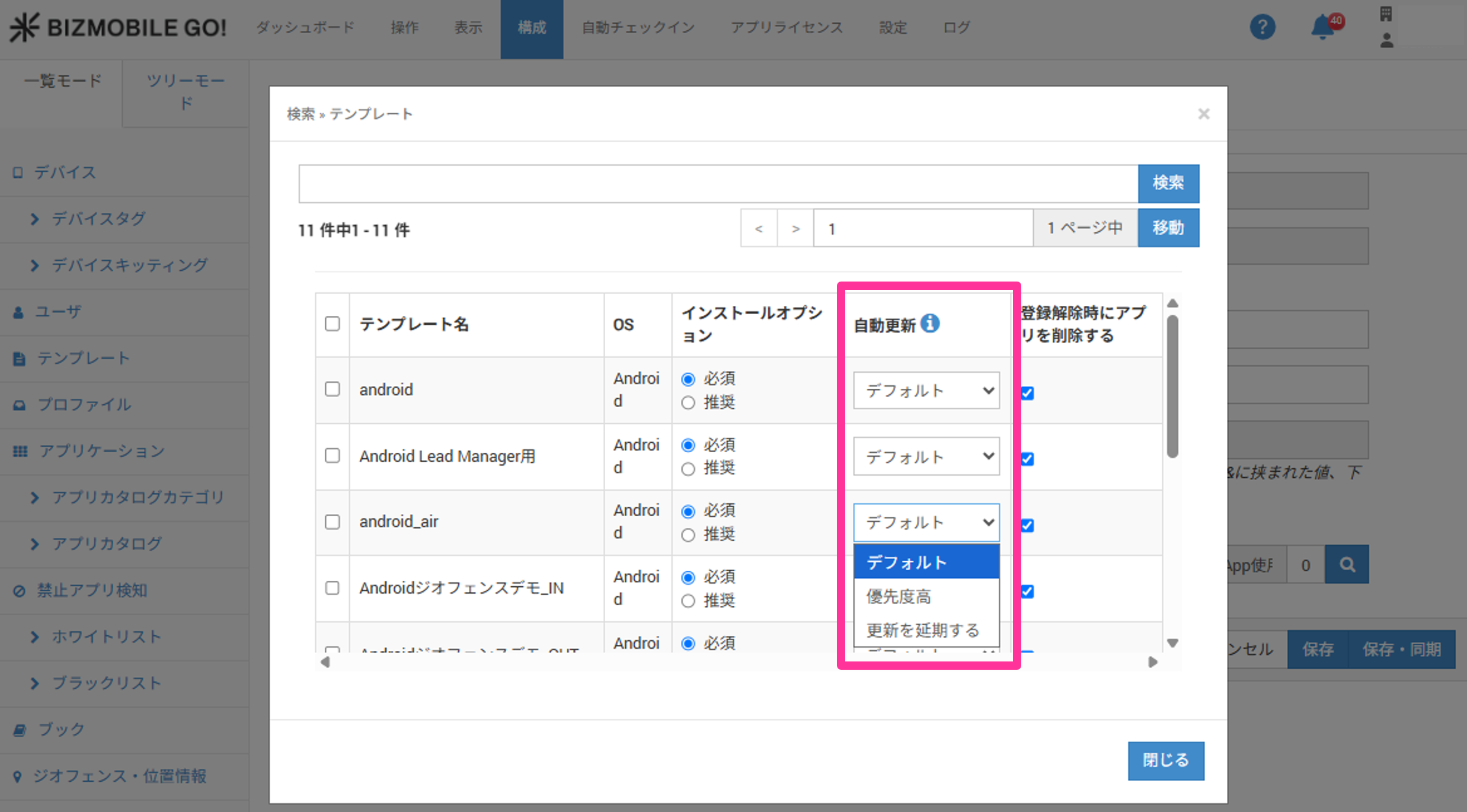 アプリケーション自動更新の設定は、テンプレートへの割り当て画面で行います。