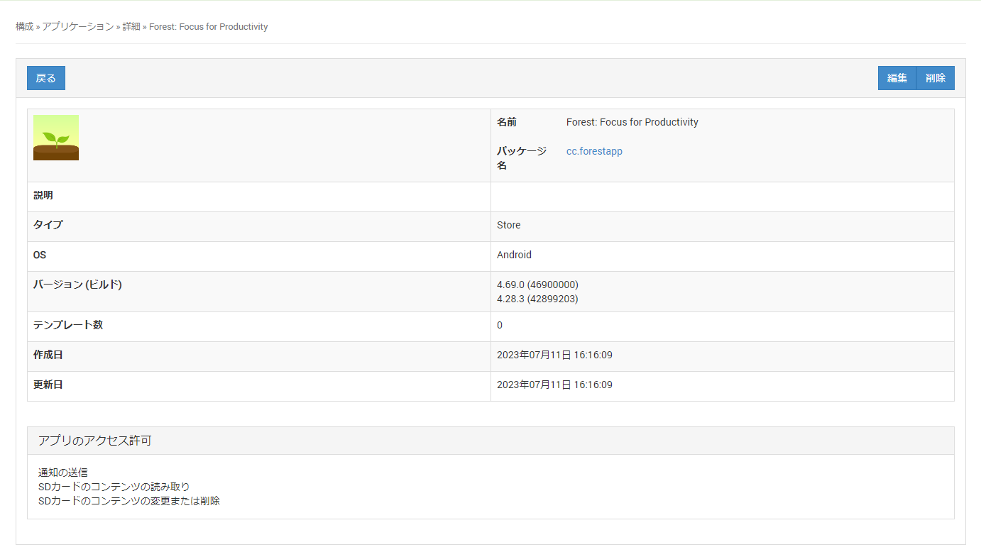テンプレート数このアプリが割り当てられているテンプレートの数