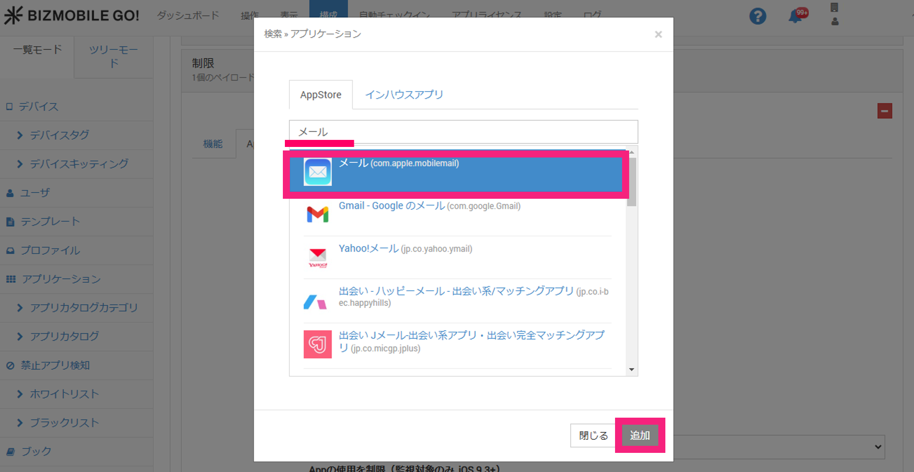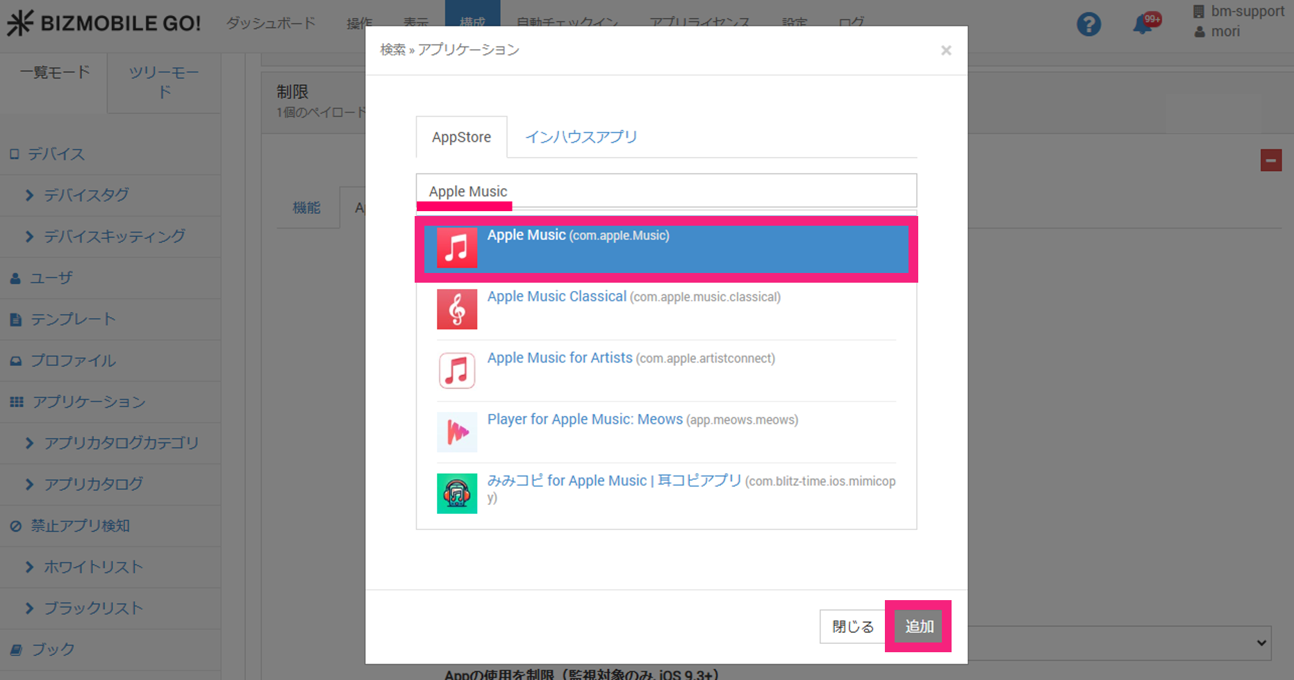 アプリ名を入力して検索し、表示された中から許可するアプリを選択して追加をクリックし、プロファイルを保存または保存・同期します。