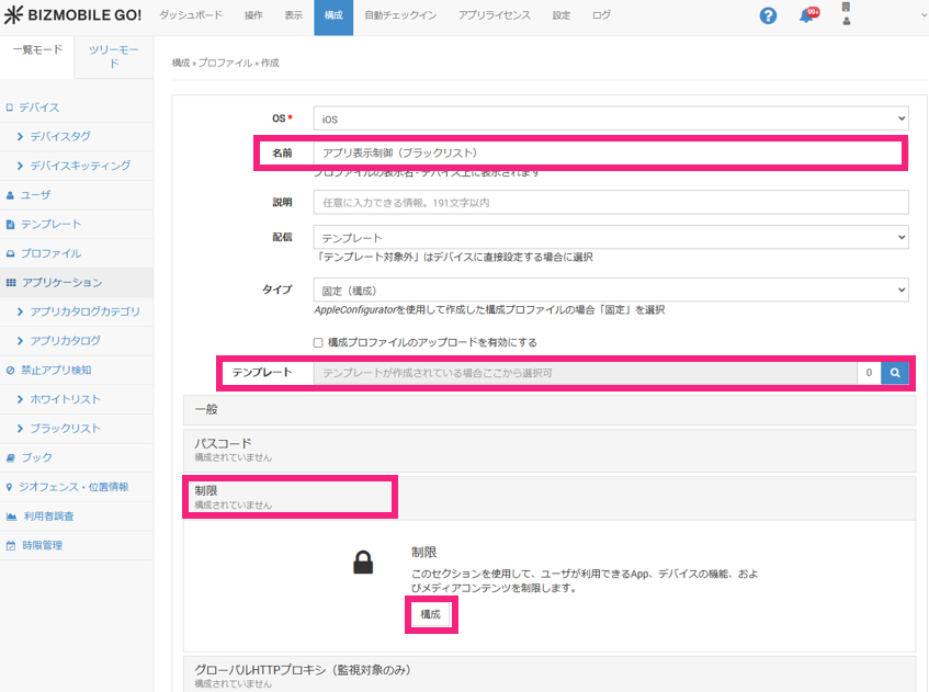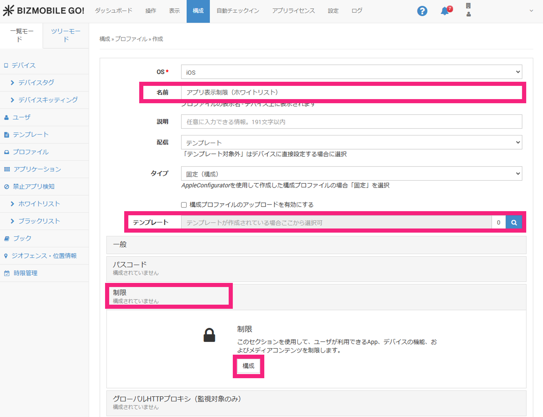 - 管理画面で、構成 > プロファイル > 作成 をクリックします。