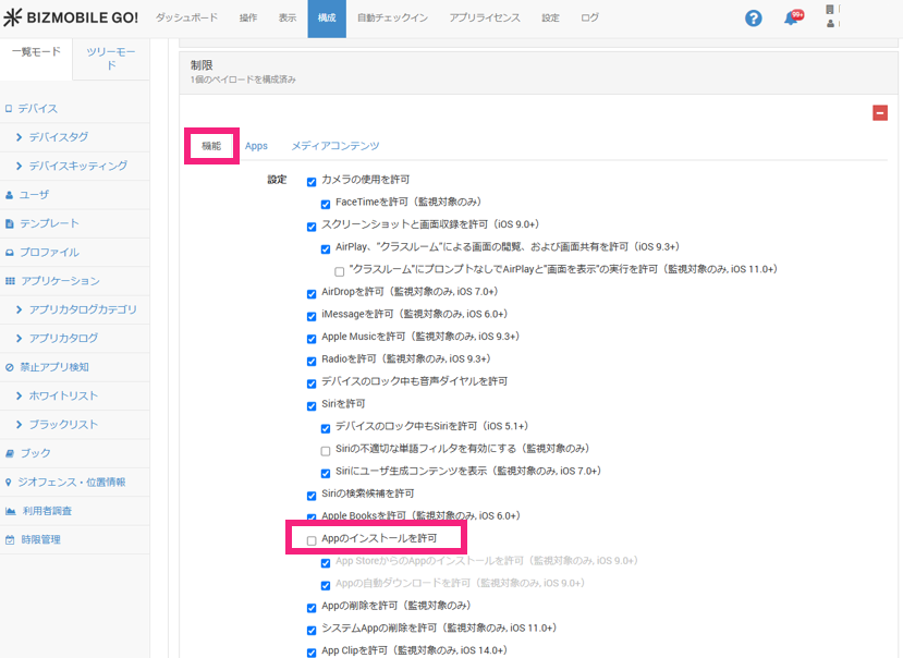 機能タブを選択し、Appのインストールを許可のチェックを外して保存します。