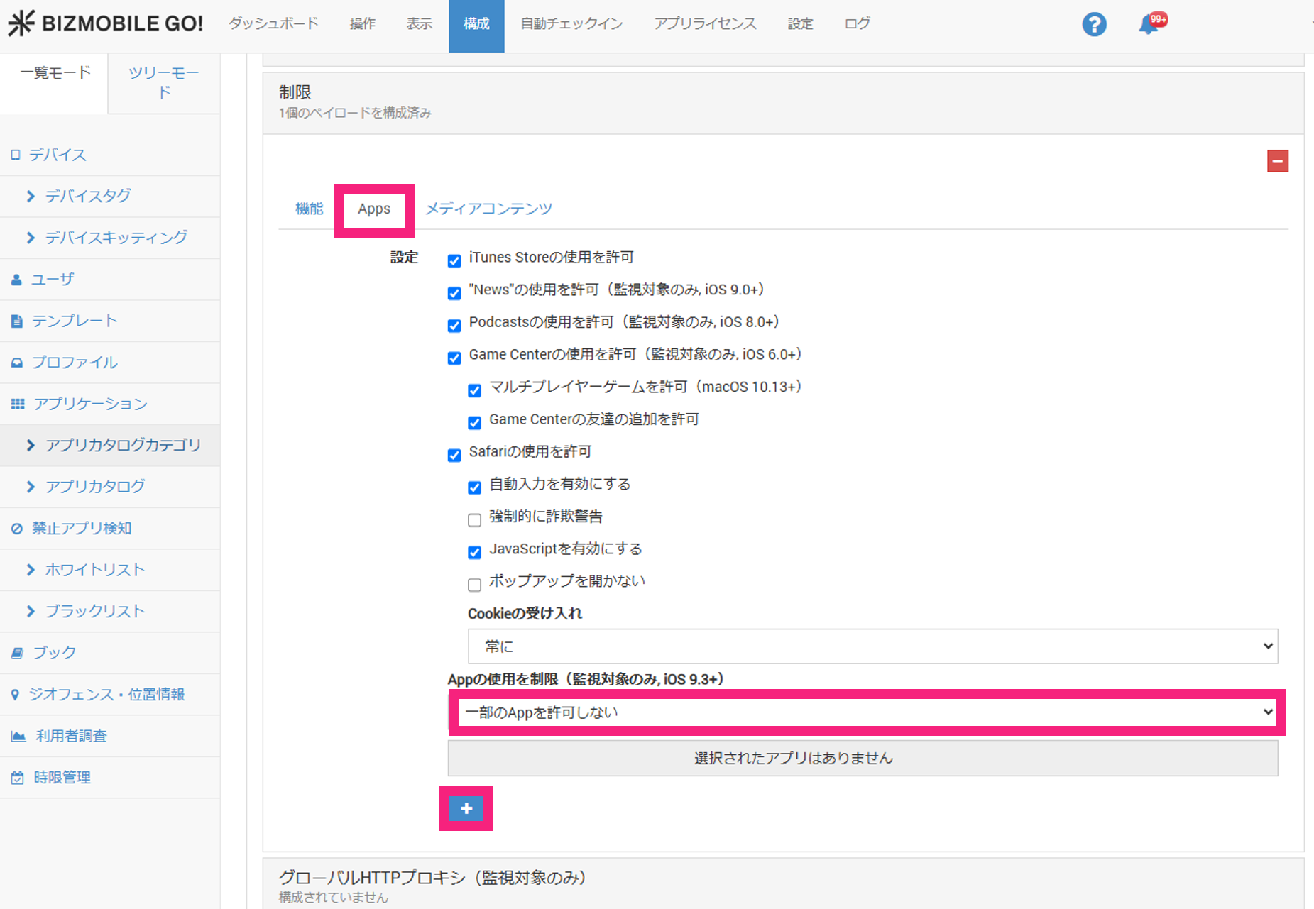 Appsタブを選択し、一部のAppを許可しないを選択して+(プラス)をクリックします。