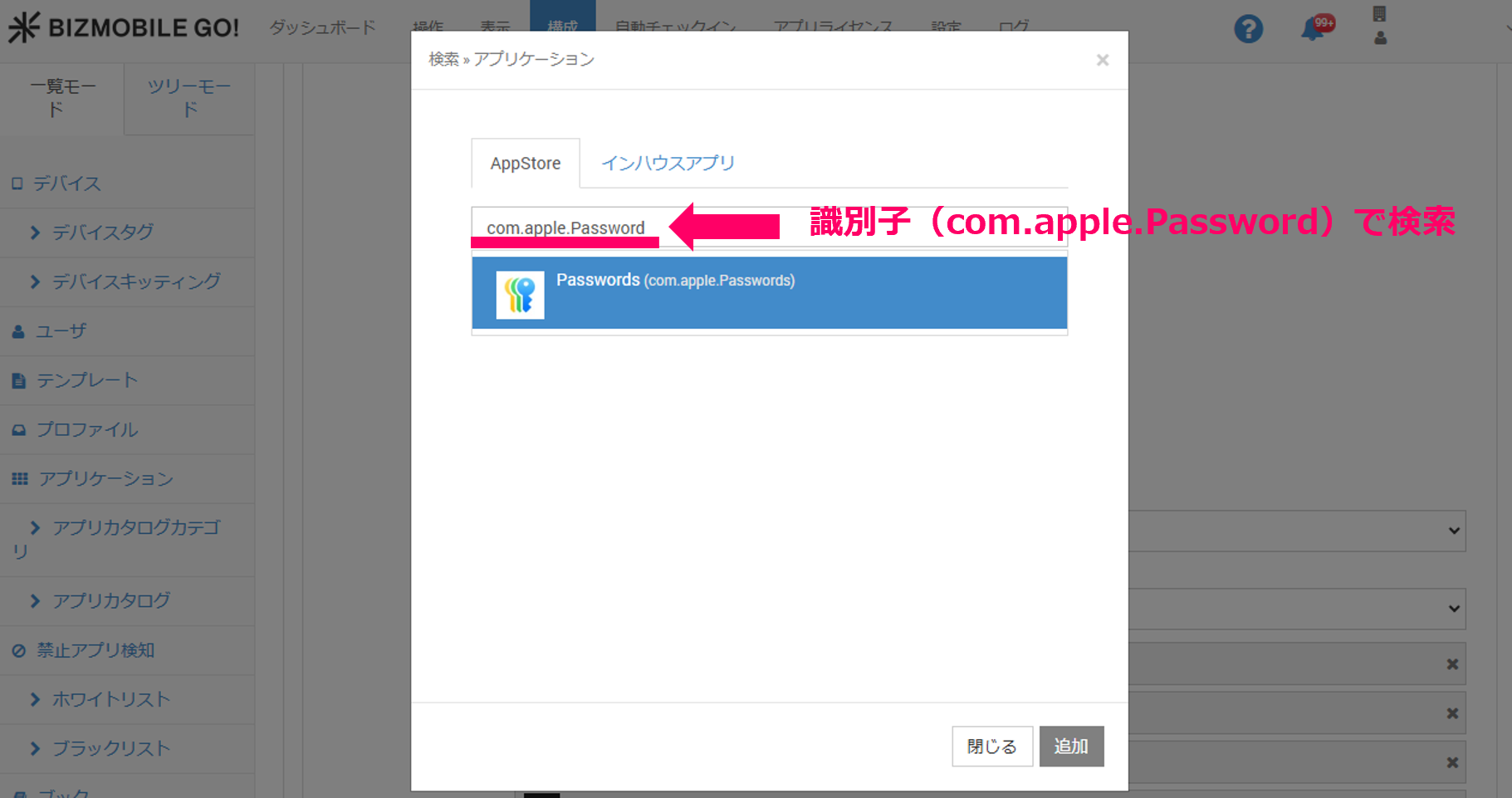 検索してもアプリが表示されない場合は、アプリの識別子を入力して検索します。