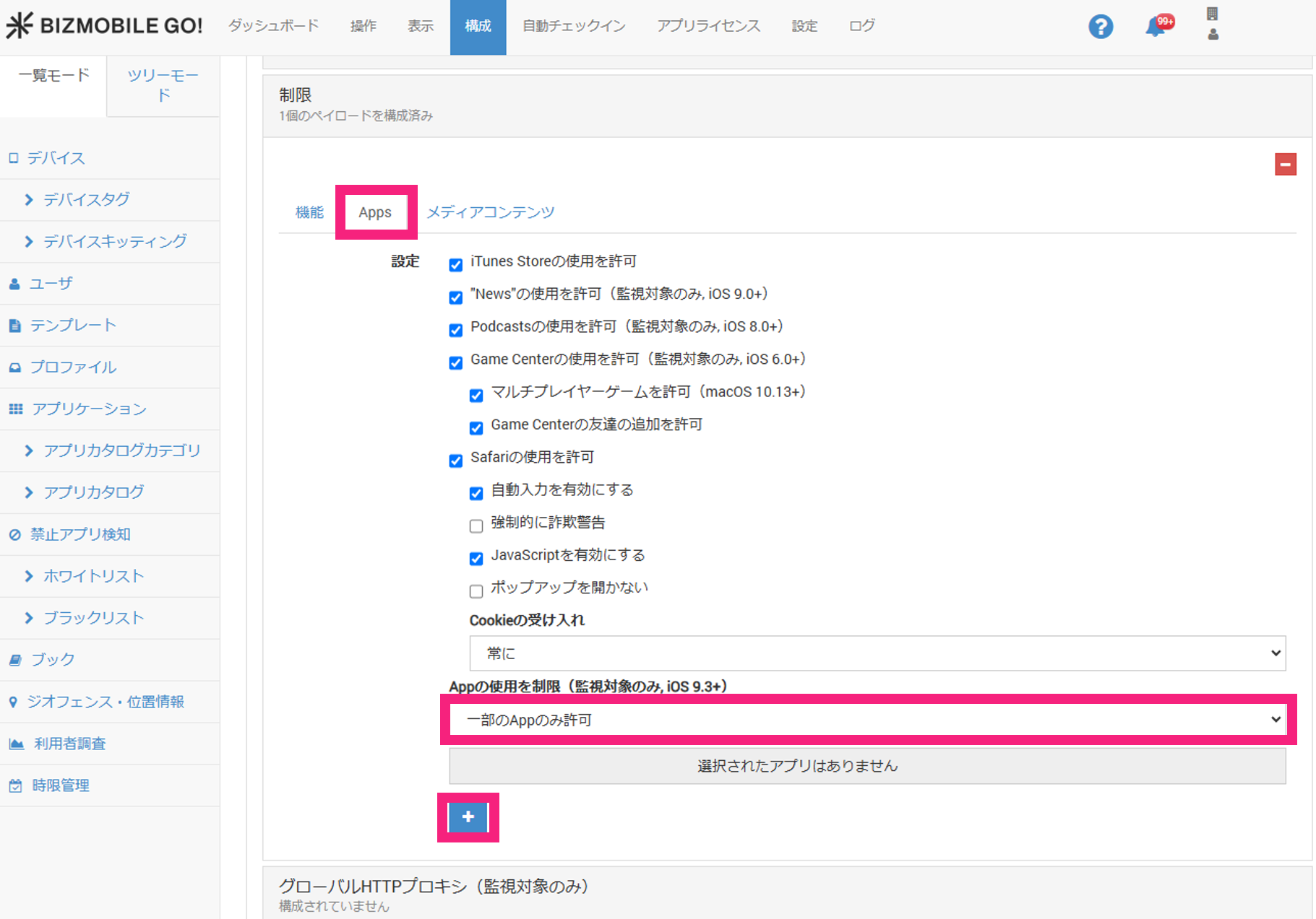 Appsタブを選択し、一部のAppのみ許可を選択して+(プラス)をクリックします。