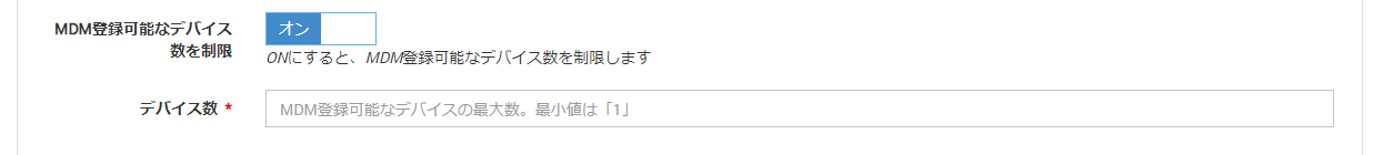 MDM登録可能なデバイス数を制限をオンとした場合、デバイス数の項目が必須となります。