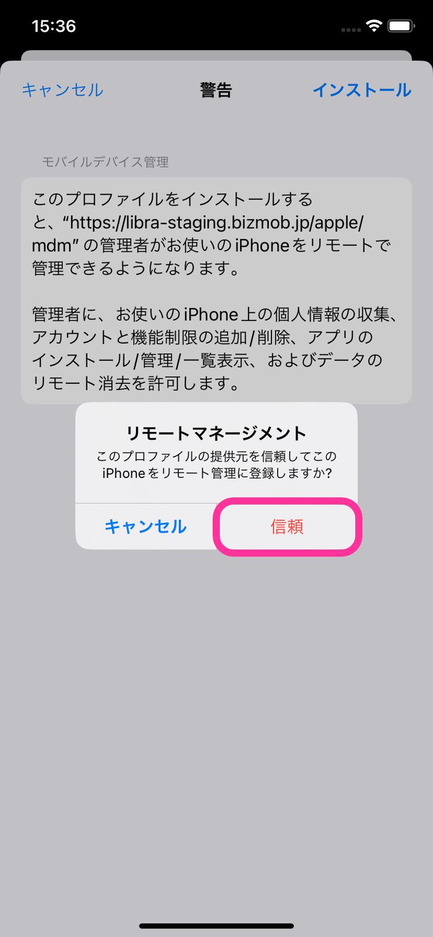 1. リモートマネジメントのポップアップが表示されたら、[信頼]をタップします。