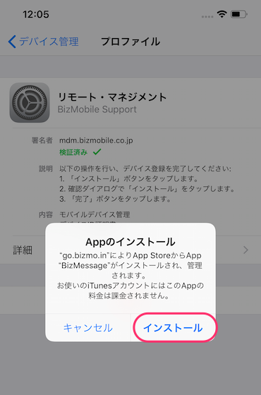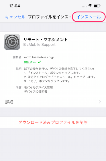 1. プロファイルをインストール画面が表示されたら、[インストール]をタップします