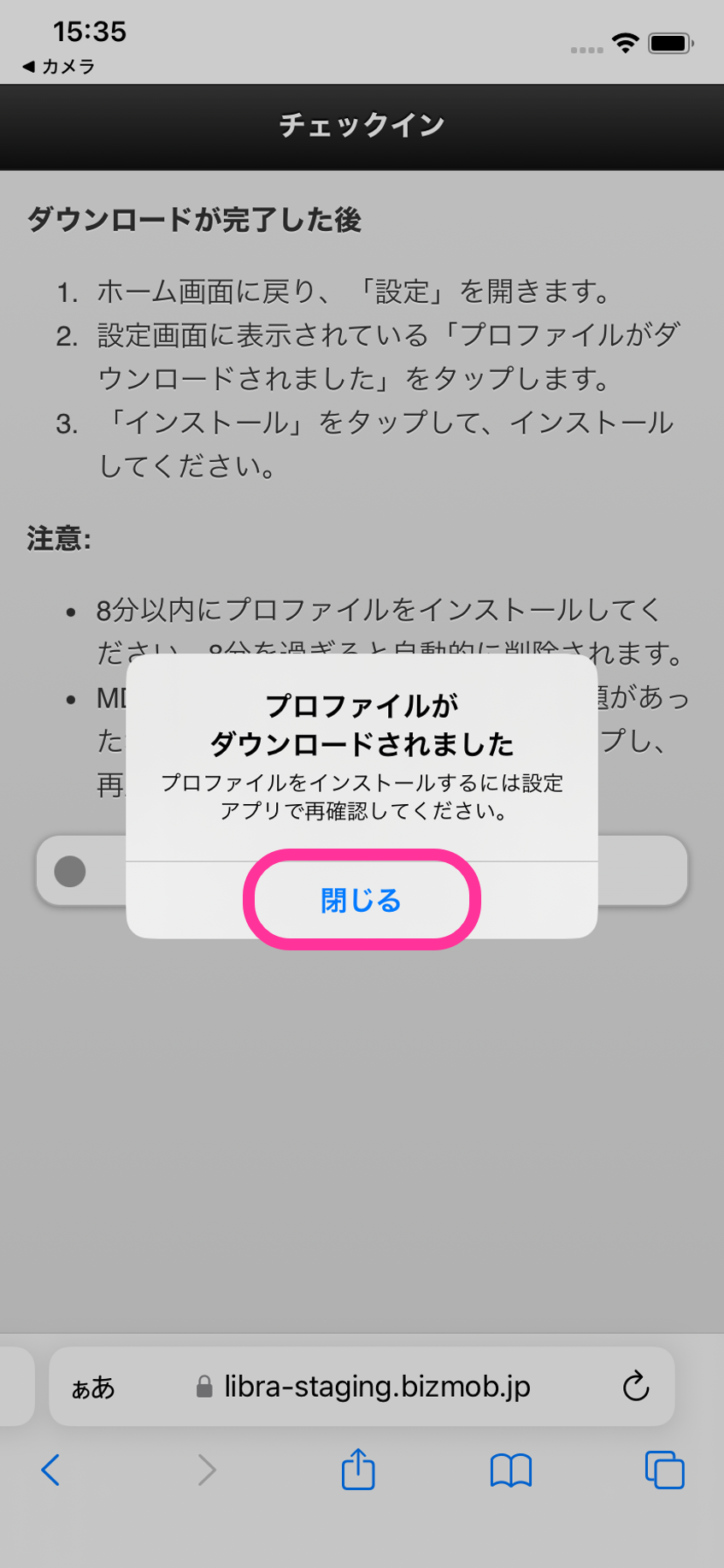 1. プロファイルがダウンロードされましたのメッセージが表示されたら、[閉じる]をタップします。