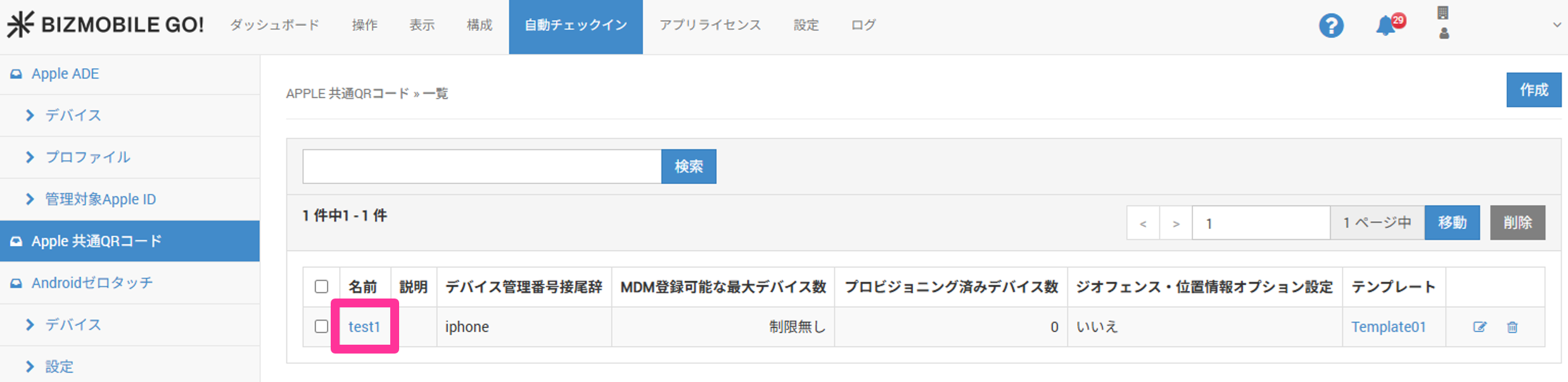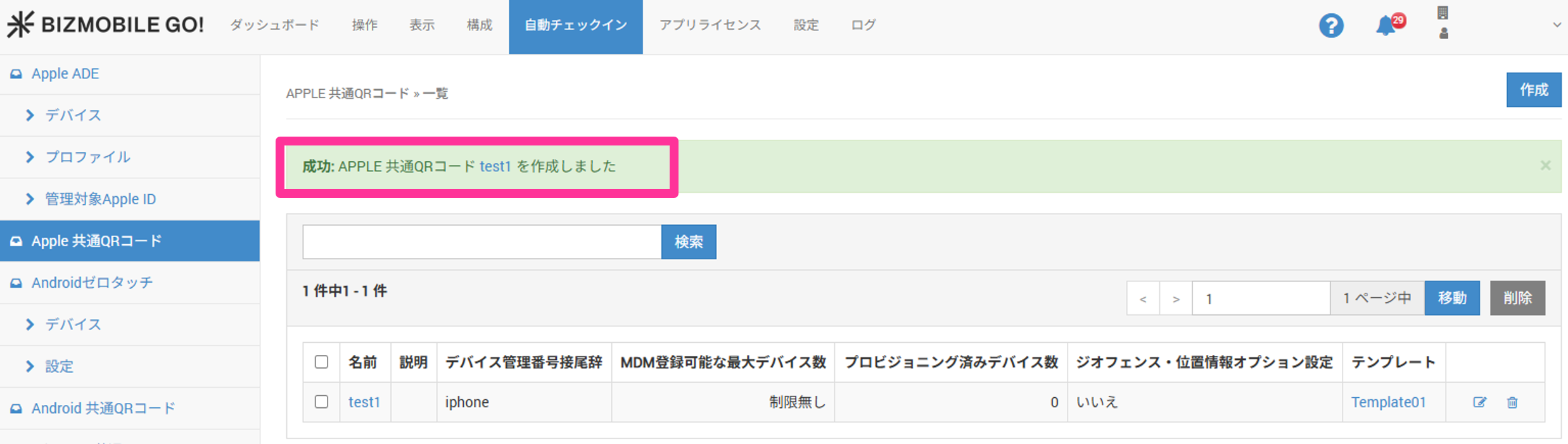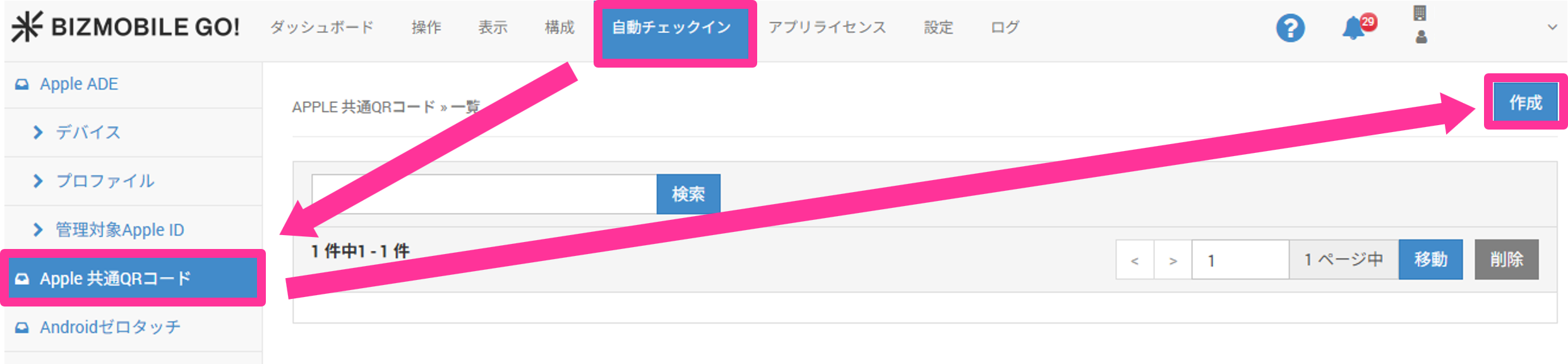 1. 自動チェックイン→Apple 共通QRコード の作成をクリックします。