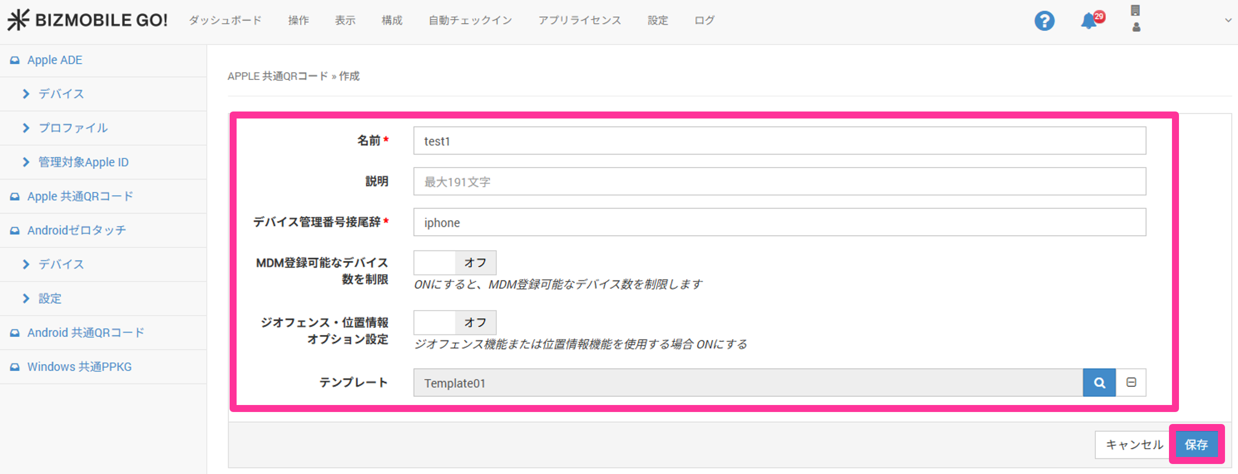 ここで選択したテンプレートは、この共通QRコードを使用してチェックインを行ったデバイスに自動的に割り当てられます。