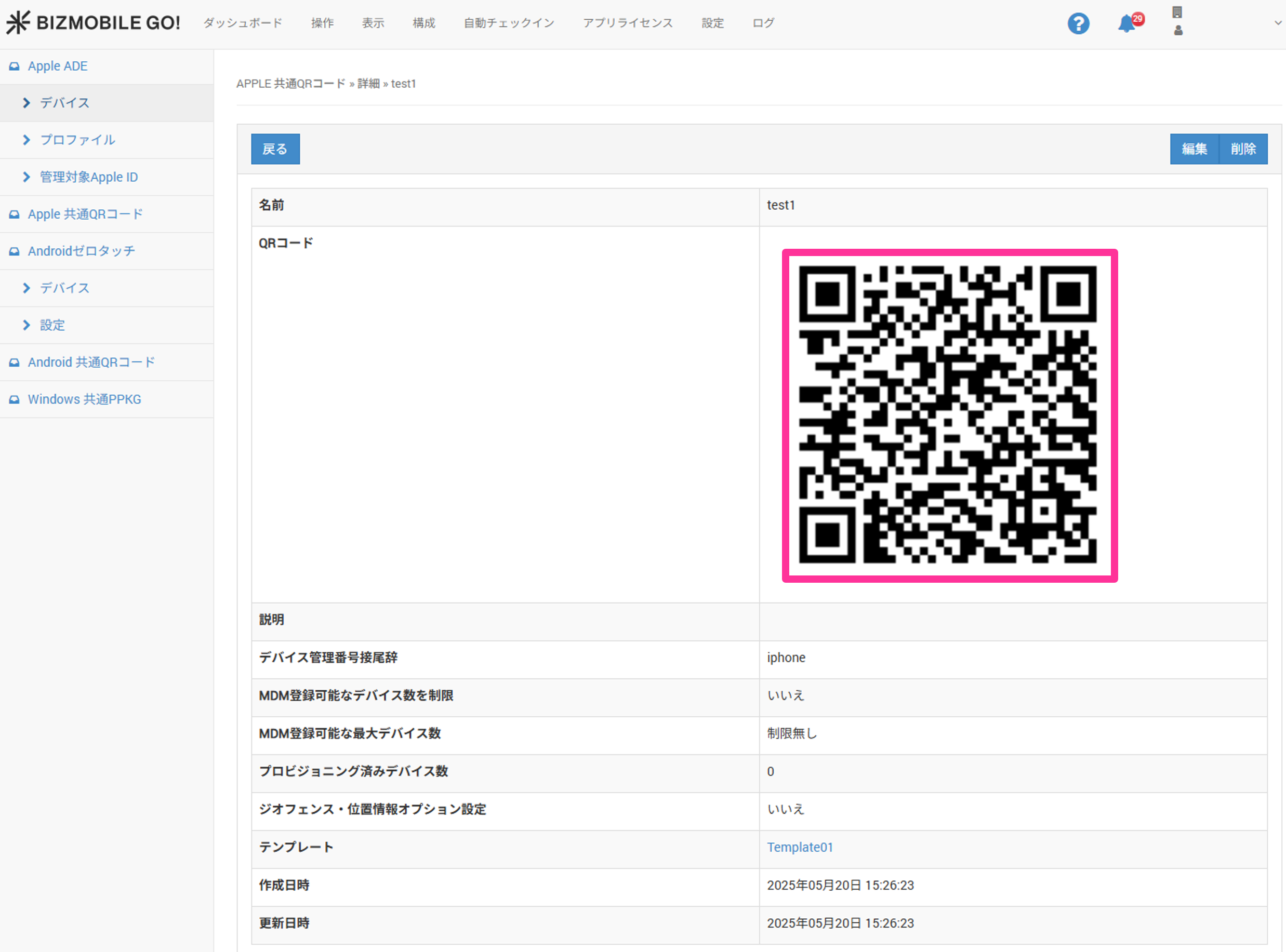 作成したデバイス共通QRコードはデバイスの管理中は削除できません。