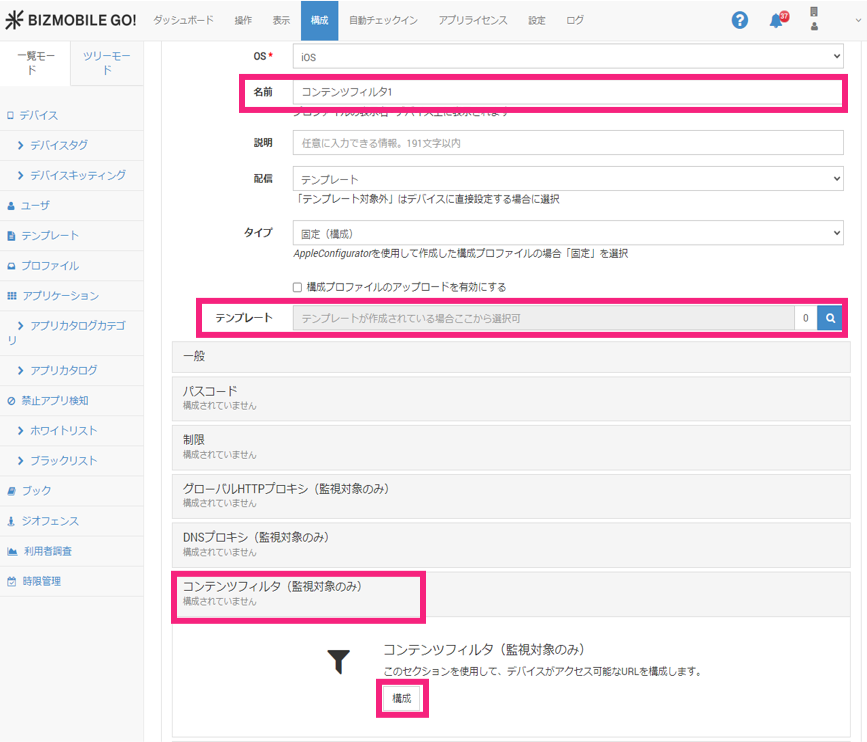 次にコンテンツフィルタをクリックして開き、構成をクリックします。