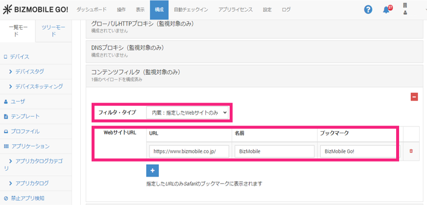 フィルタ・タイプに指定したWebサイトのみを選択すると、必要なWebサイトにのみアクセスさせることが可能です。