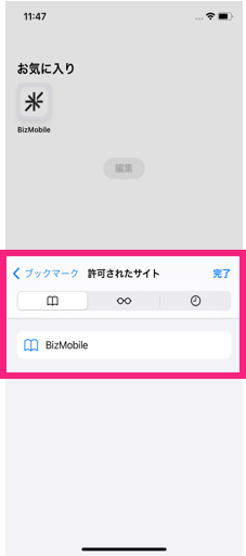 ブックマークに許可されたサイトとして登録したサイトが表示されることを確認します。