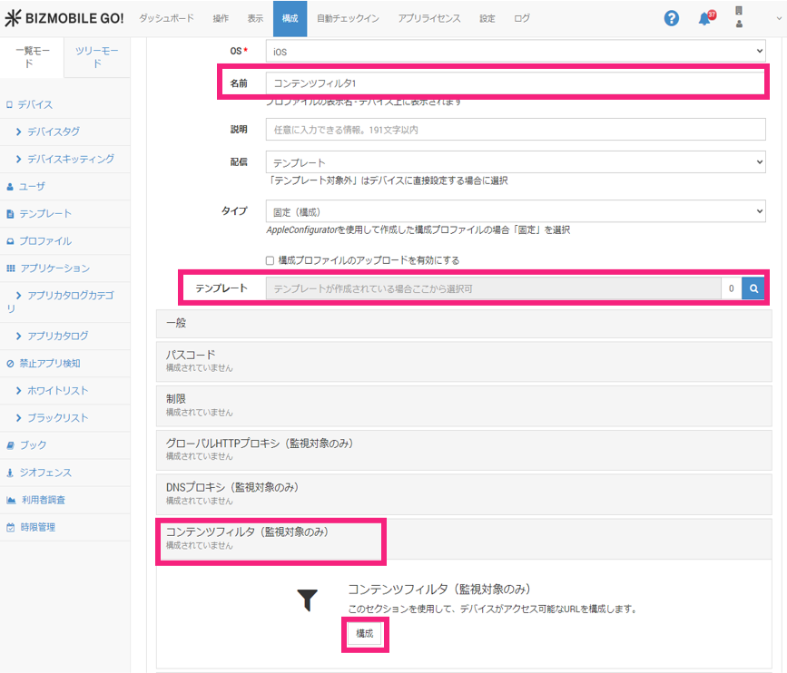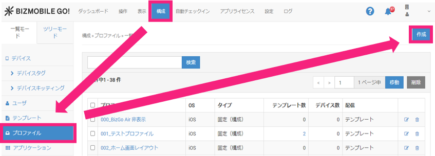 - 管理画面で、構成 > プロファイル > 作成 をクリックします。