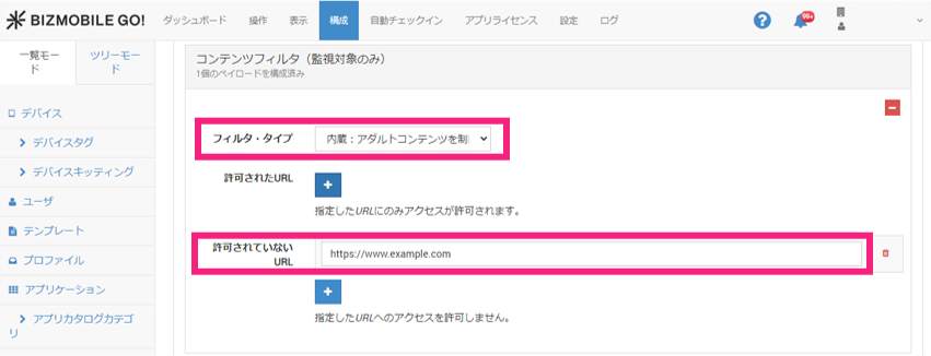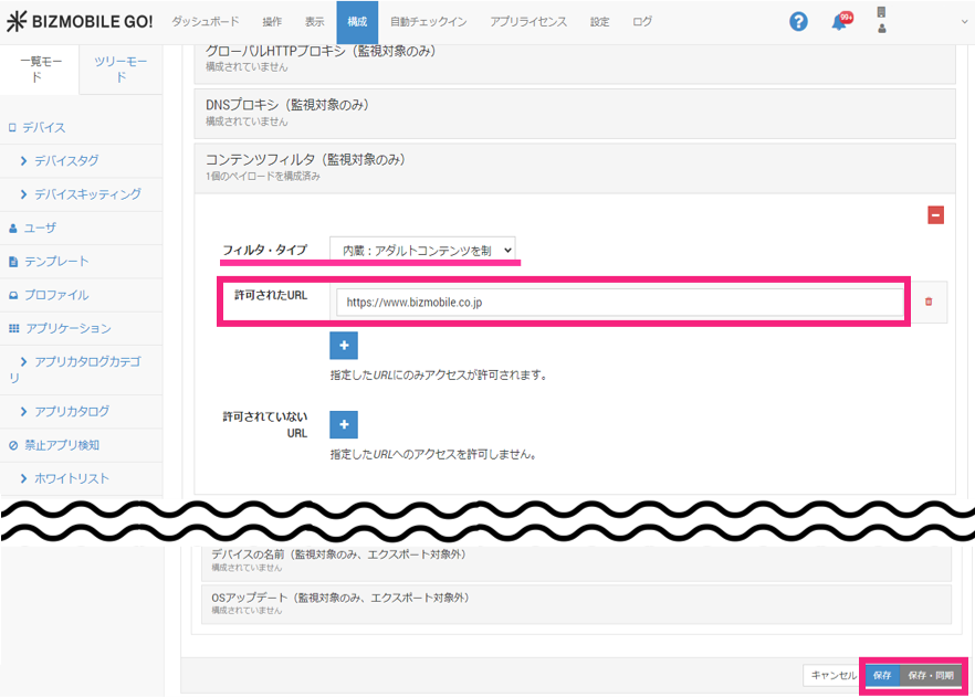 コンテンツフィルタをクリックし、フィルタ・タイプにアダルトコンテンツを制限が指定されていることを確認のうえ、許可されたURLに許可するサイトのURLを入力して保存または保存・同期します。