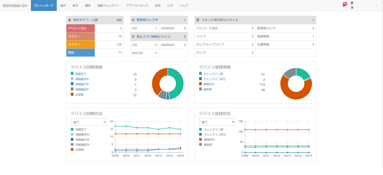 BizMobile Go!へのログインに成功すると、管理対象ユニットのダッシュボードと呼ばれる画面が開きます。この画面からすべての機能にアクセスすることができます。