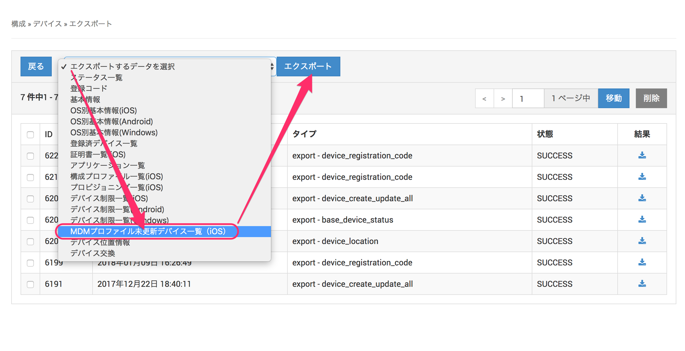 2. エクスポートするデータを選択をクリックしてMDMプロファイル未更新デバイス一覧(iOS)をクリックして選択の上、[エクスポート]をクリックします。
