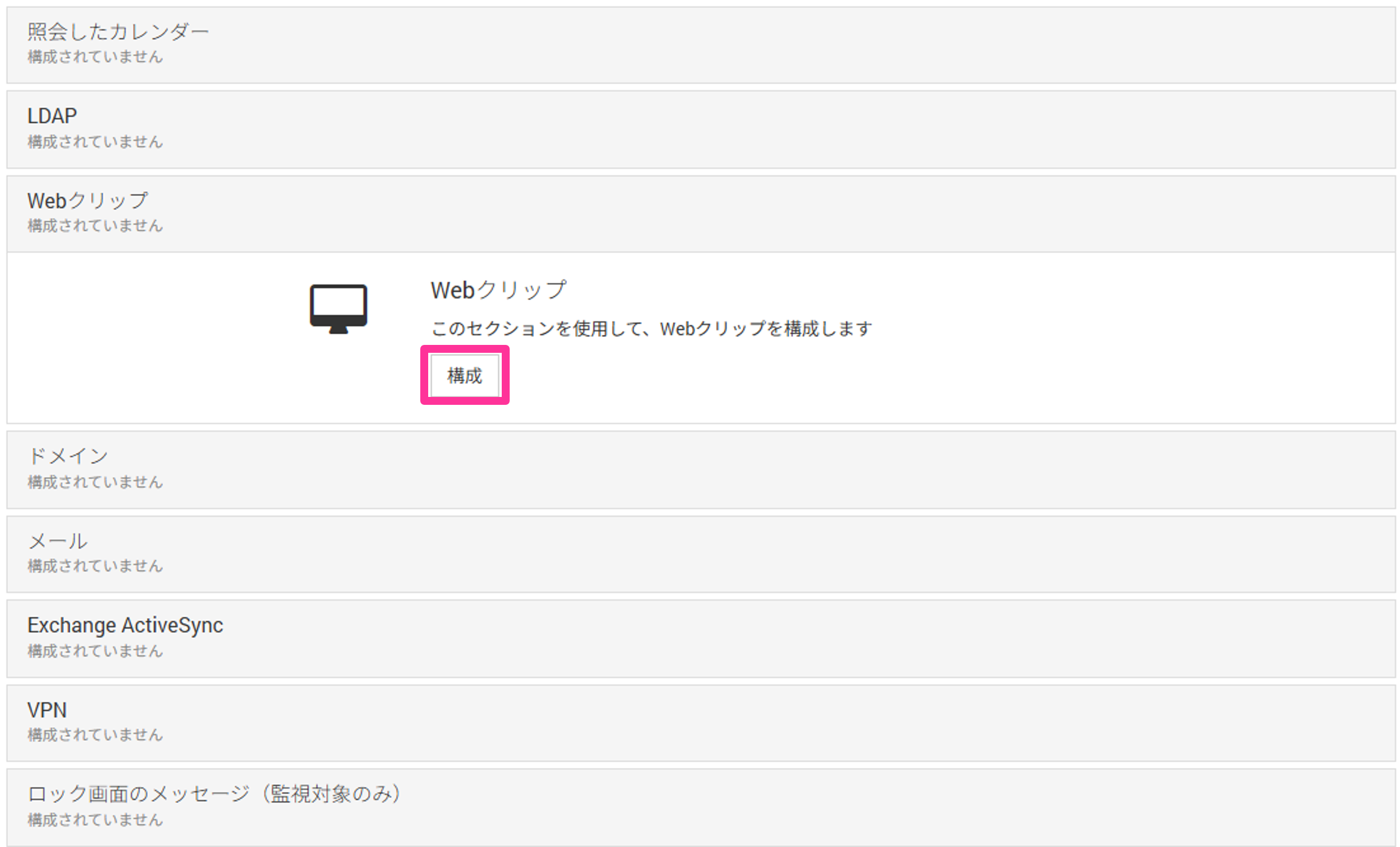 1. プロファイル作成画面にて、Webクリップ→[構成]をクリックします。