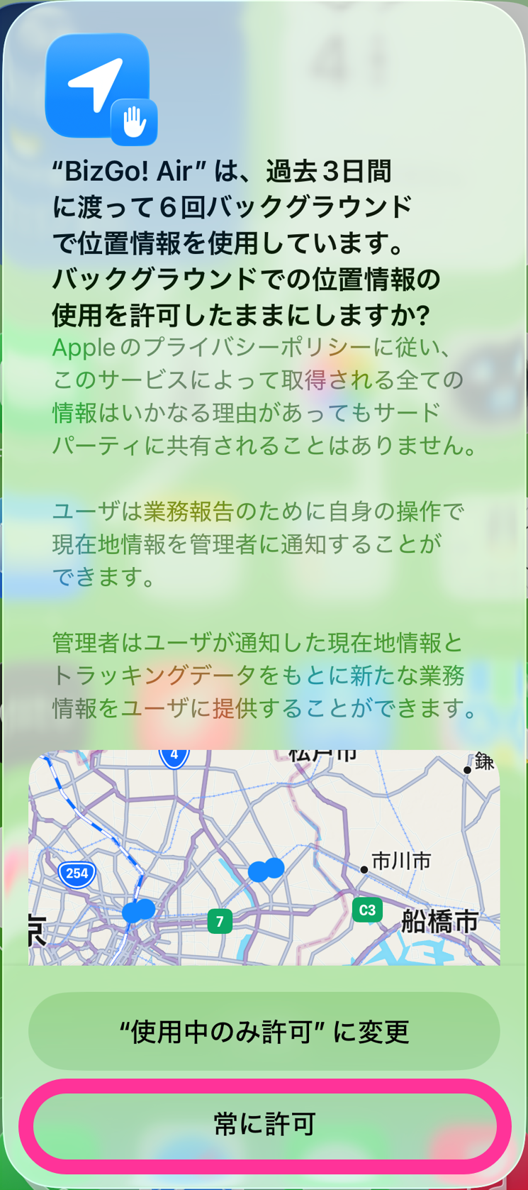 BizGo! Air の位置情報設定を「常に」にしている場合、端末上に以下のポップアップが表示されることがあります。