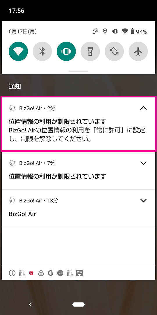 位置情報が許可されていないデバイスへ、位置情報許可の設定を「常に」とするよう設定変更を依頼する通知を送信します。