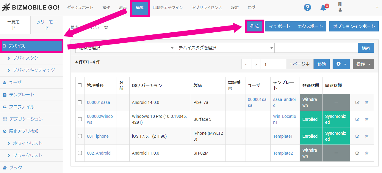 1. 管理画面で、デバイス新規作成の場合は、構成 > デバイスを選択し、[作成]を押下します。