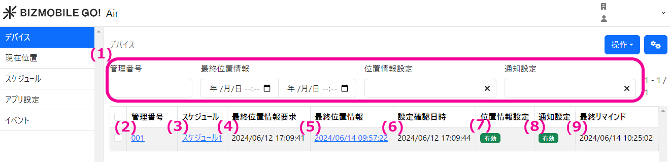 管理番号``最終位置情報取得日時``位置情報設定``通知設定``最終リマインド情報でデバイスを絞り込みできます。