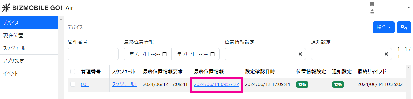 管理画面から位置情報を取得を行った最後の日時が表示されます。