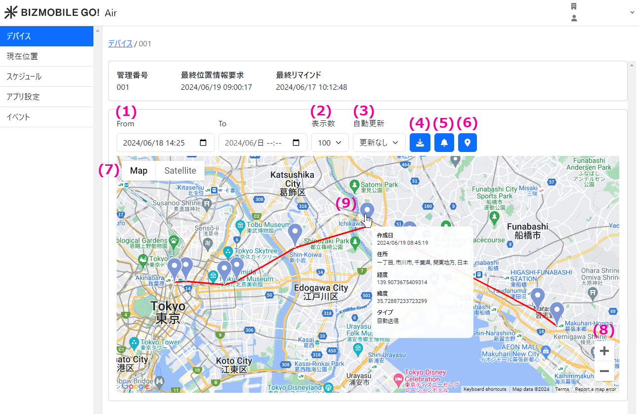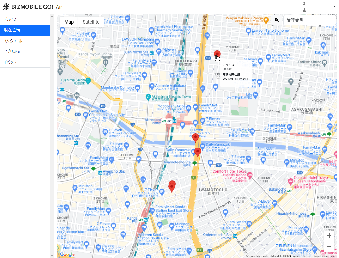 デバイス側での設定が完了すると、管理画面でデバイスの位置情報を確認できるようになります。