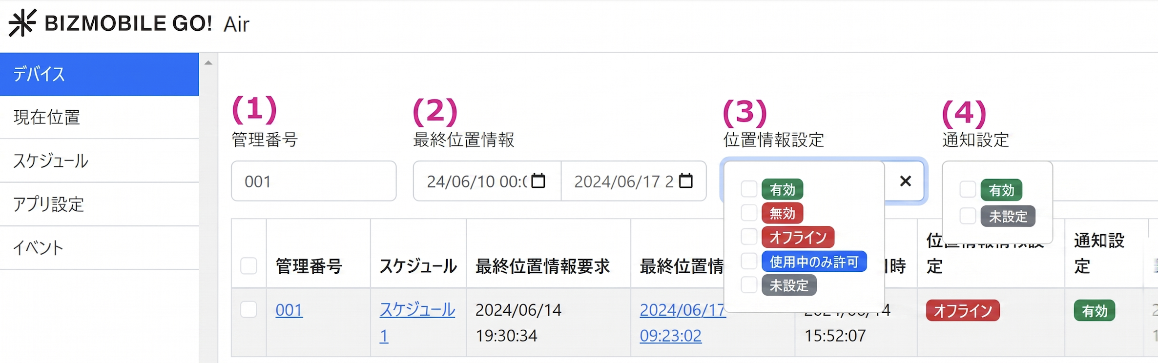 【構成】→【ジオフェンス・位置情報】画面で、メッセージ送信の対象デバイスを検索します。
