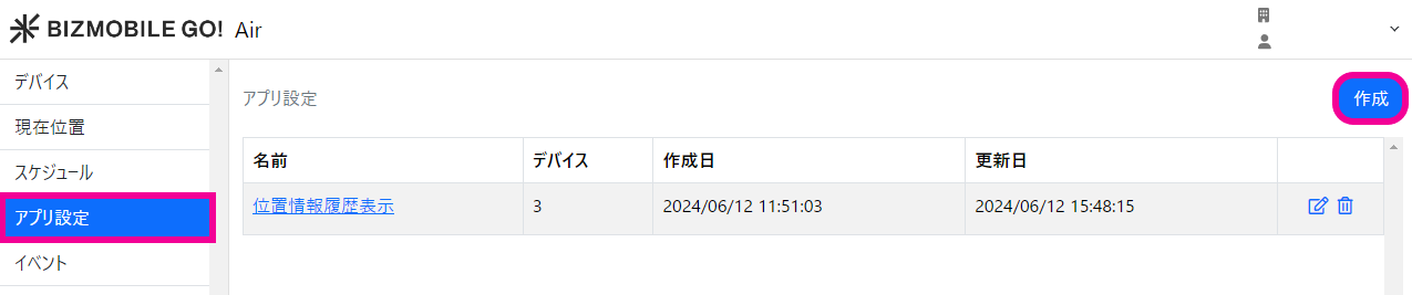 2. 【アプリ設定】を選択し、作成をクリックします。